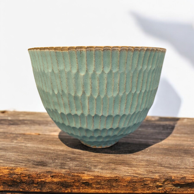 Wheel-thrown in a soft grey stoneware clay. Hand-carved, fired, then glazed externally in a satin matt sea-fog green. Internally the glaze is a satin white